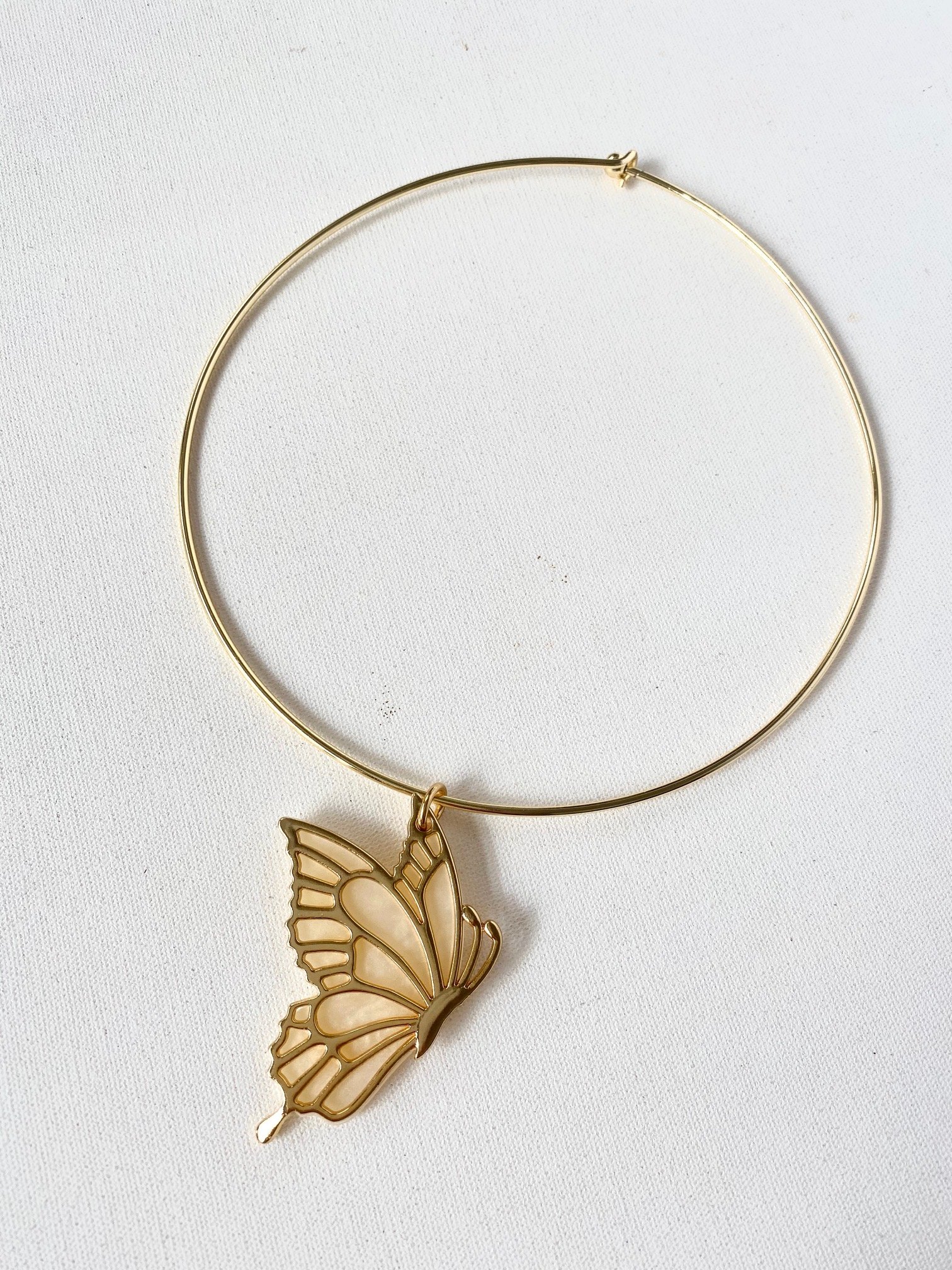 Aro rígido de metal dourado com pingente de metal e acrílico perolado