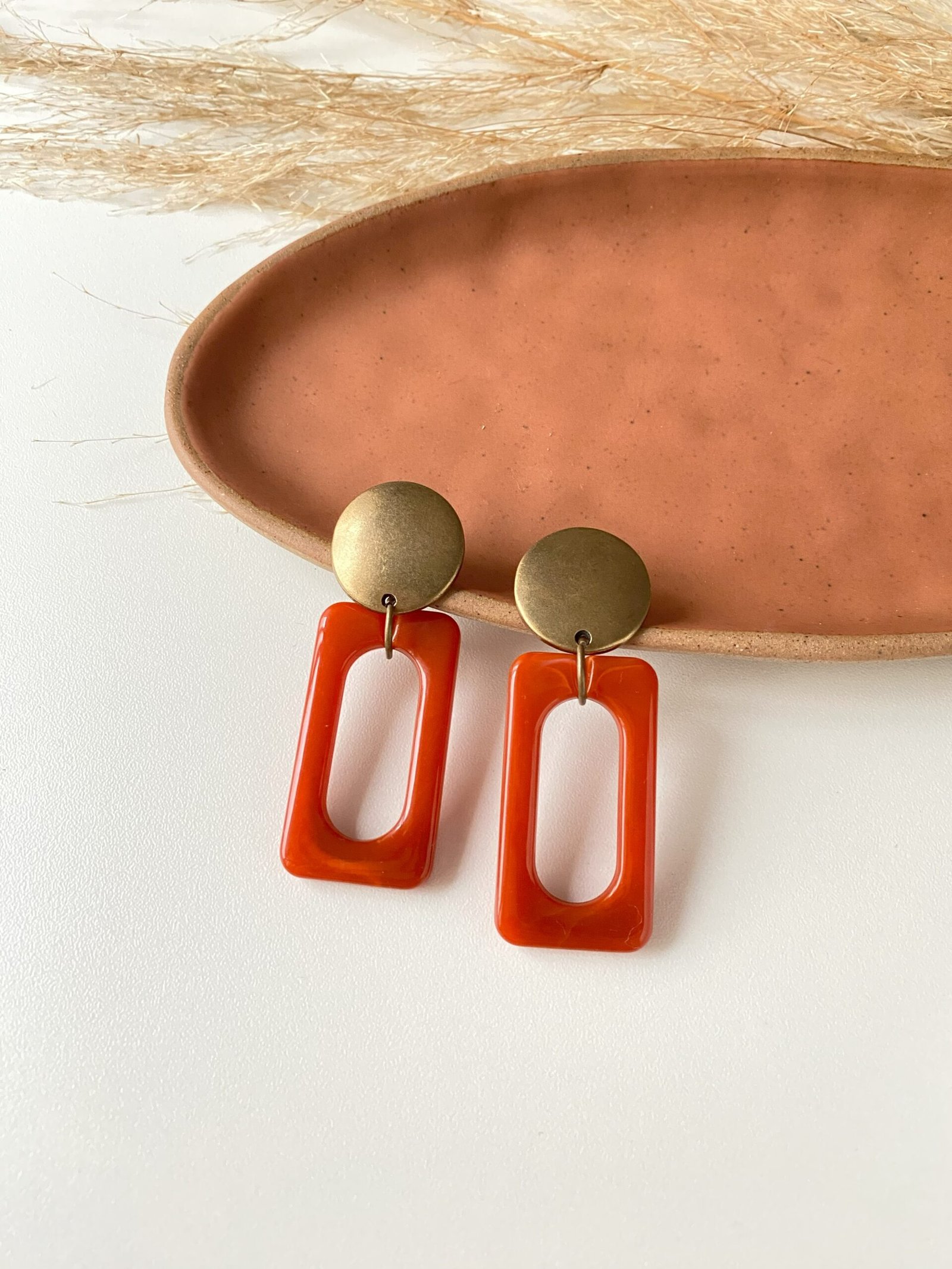 Maxi brinco com pino de metal ouro velho redondo e pingente de acrílico terracota