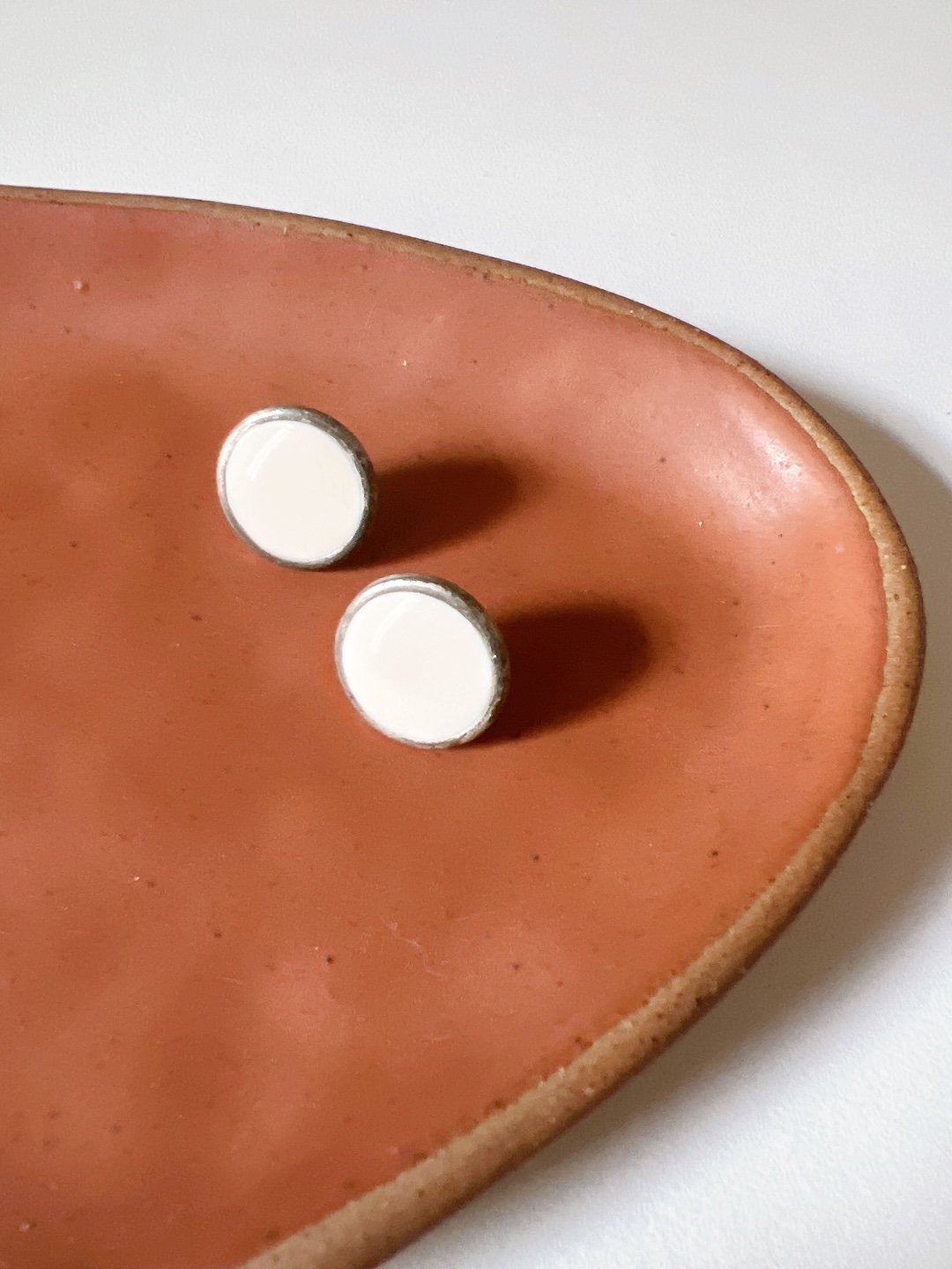 Mini brinco botão prateado com resina branca