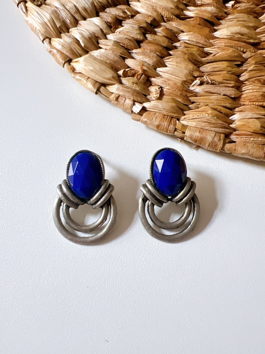 Mini brinco em metal prateado com chaton oval azul bic